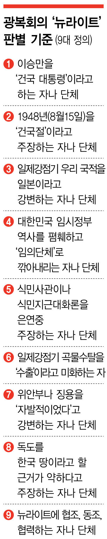 뉴라이트는 국민·영토·주권이라는 국가의 3요소가 갖춰지지 않았다는 이유를 들어 임시정부와 광복절을 평가절하한다. 하지만 정작 뉴라이트가 숭상하는 이승만 대통령은 ‘민국 30년’이란 연호를 쓰며 1919년 임시정부가 수립된 해가 건국의 뿌리임을 분명히 했다. 또 뉴라이트는 반일 민족주의를 혐오하지만, 이승만 대통령은 강경한 반일 민족주의자였다. 뉴라이트가 그런 이승만 대통령을 숭상하고 남한 단독정부 수립일을 건국절로 만들자고 주장하는 것 자체가 논리적 모순인 셈이다.