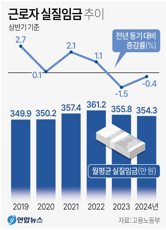 실질임금은 근로자에게 실제로 지급된 명목임금에서 물가 변동의 영향을 제거한 값이다. 근로자 주머니에 실제로 들어오는 수입을 뜻한다. 올해 상반기 근로자들의 월평균 명목임금은 403만 2000원으로 작년 동기 대비 9만 4000원(2.4%) 늘었으나 같은 기간 소비자 물가지수 상승률은 2.8%에 달했다. 고물가 영향으로 근로자들의 실질임금은 2022년과 2023년 각각 전년 대비 0.2%와 1.1% 감소했다.