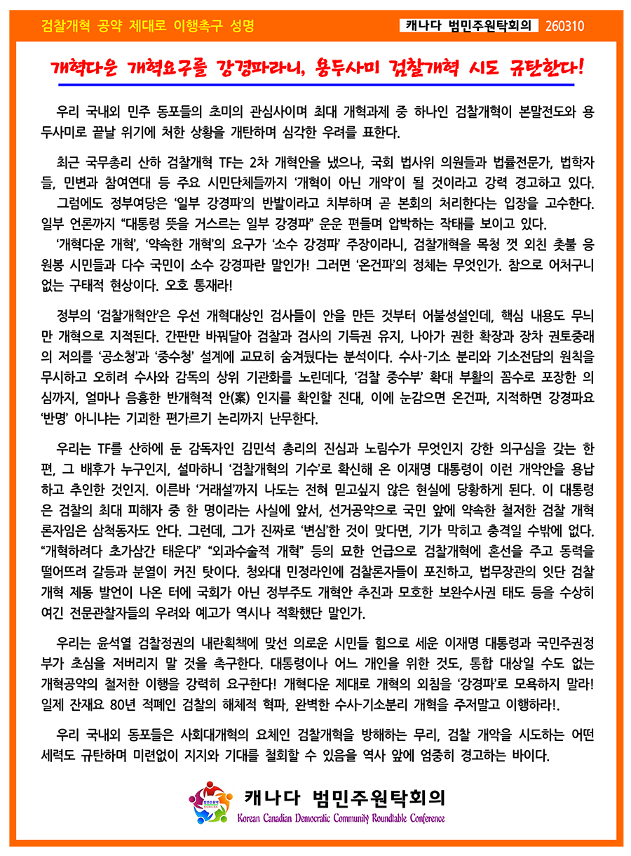 | 캐나다 범민주원탁회의, '검찰개혁' 공약 제대로 이행촉구 성명 발표 (0) | 2026.03.12 |
