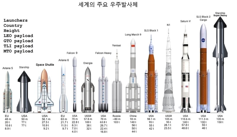 누리호는 높이는 맨 왼쪽 아리안 5호와 비슷하지만, 추력은 10분의 1이 안 된다. 위키미디어 코먼스