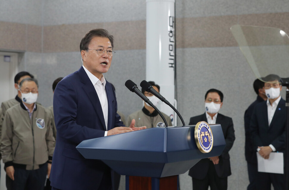 발사체가 700㎞ 지점에 도달했다는 소식과 함께 ‘사실상 성공’으로 알려졌던 누리호의 성과가 좀 더 정확히 수정된 건 문재인 대통령에 의해서다. 21일 오후 5시 누리호의 도전을 참관한 문 대통령은 발사 1시간10여분 뒤 직접 대국민 메시지를 통해 “목표에 완벽하게 이르진 못했지만 첫번째 발사로 매우 훌륭한 성과를 거뒀다”고 말했다.