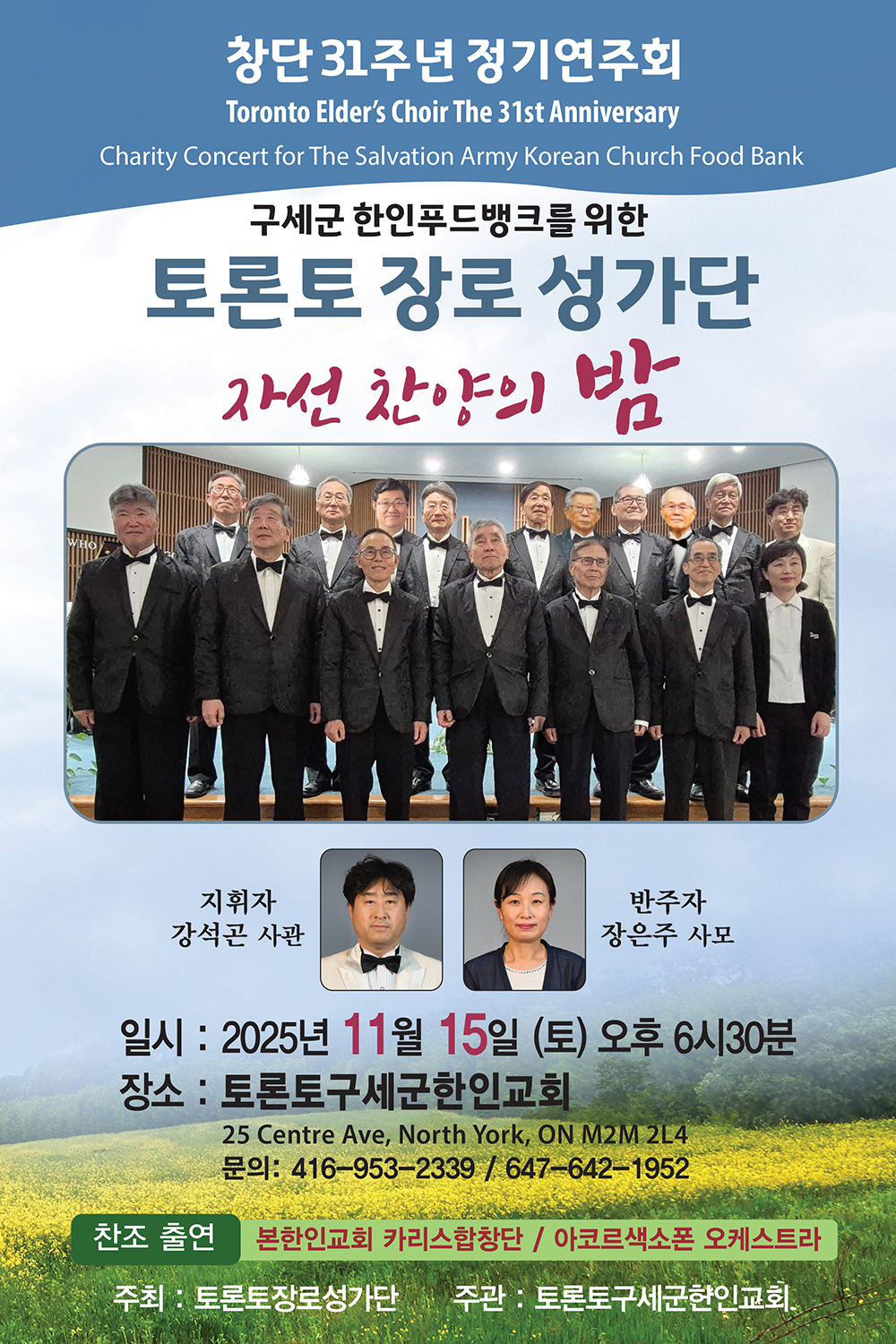 「장로성가단」(Toronto Elders Choir)이 오는 11월15일(토) 오후 6시30분 구세군 토론토한인교회(25 Centre Ave. North York, M2M 2L4)에서 창단 31주년 기념 정기연주회를 겸해 구세군 한인 푸드뱅크 후원을 위한 ‘자선 찬양의 밤’을 개최한다.