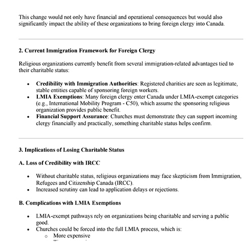 이밖에 사역자 청빙에도 영향을 줄 것으로 우려됐다. 현재 종교 단체는 자선단체 지위를 기반으로 캐나다 이민당국(IRCC)의 신뢰와 LMIA(노동시장영향평가) 면제 프로그램 등 비교적 수월한 절차로 해외 목회자와 선교사, 사역자 등을 초청할 수 있으나, 자선단체 지위를 잃으면, IRCC의 이민 신청 지연 혹은 거절 가능성이 커지고, LMIA 면제혜택이 사라져 초청 절차와 비용·시간 소요부담에 승인 가능성도 낮아질 수 밖에 없어 사역자 청빙의 어려움과 해외 교류 및 협력에도 큰 지장을 초래할 것이라는 경고다.