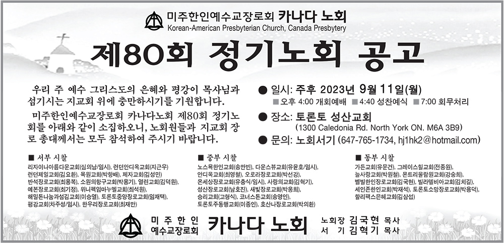 | KAPC 카나다 노회, 2023 가을 정기노회 9월11일 성산교회서 (0) | 2023.08.29 |