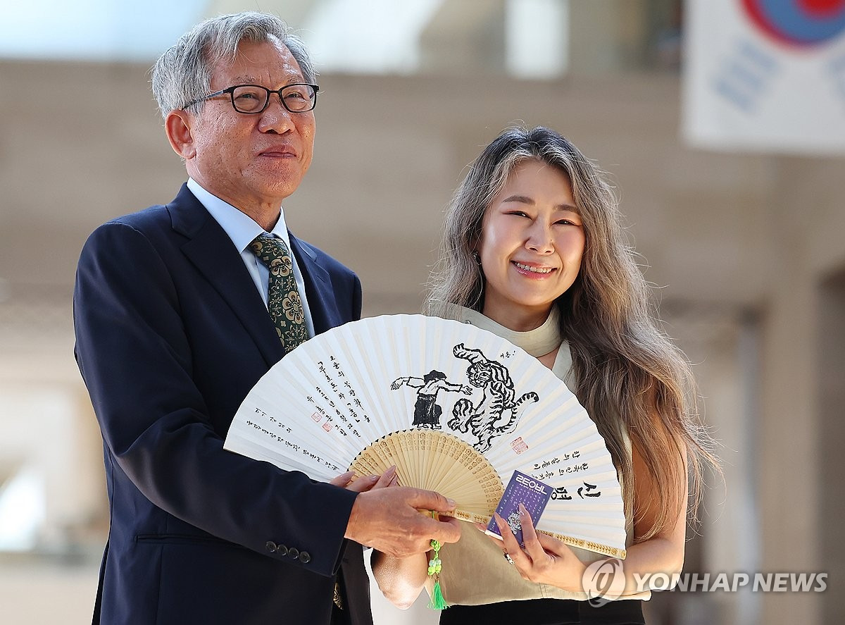 유홍준 관장으로부터 선물 받는 '케데헌' 매기 강 감독 = 넷플릭스 애니메이션 '케이팝 데몬 헌터스'의 매기 강 감독(오른쪽)이 21일 서울 용산구 국립중앙박물관을 방문해 유홍준 관장으로부터 부채와 까치·호랑이 배지 선물을 받은 뒤 기념촬영을 하고 있다. 2025.8.21