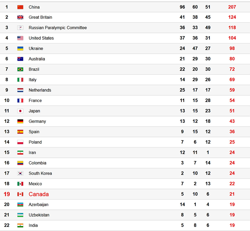캐나다는 19위…금 5, 은 10, 동 6 등 모두 21개 메달 획득