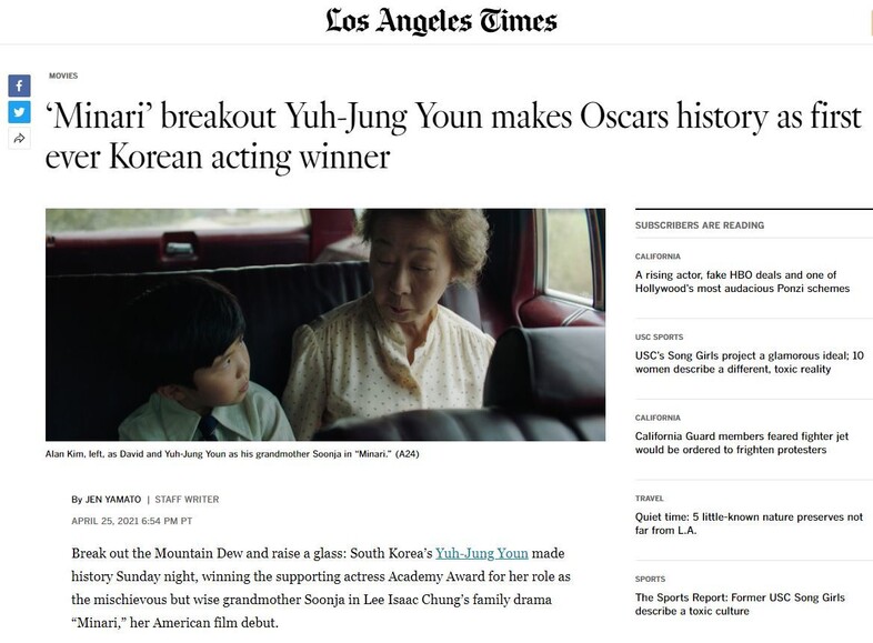 <로스엔젤레스 타임스>의 윤여정씨 수상 관련 보도. 누리집 갈무리