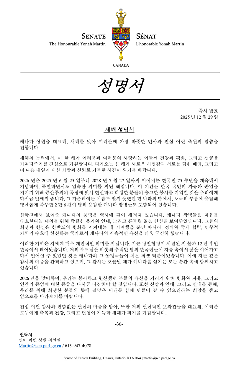 연아 마틴 의원은 이어 “2026년을 맞으며 우리는 봉사하고 헌신했던 분들의 유산을 기리기 위해 평화와 자유, 그리고 인간의 존엄에 대한 존중을 다시금 다짐해야 할 것”이라며 “또한 신앙과 연대, 그리고 인내를 통해, 우리를 위해 희생한 분들의 뜻에 걸맞은 미래를 함께 만들어 갈 수 있으리라는 희망을 품고 앞으로를 바라보기 바란다”고 소망했다.