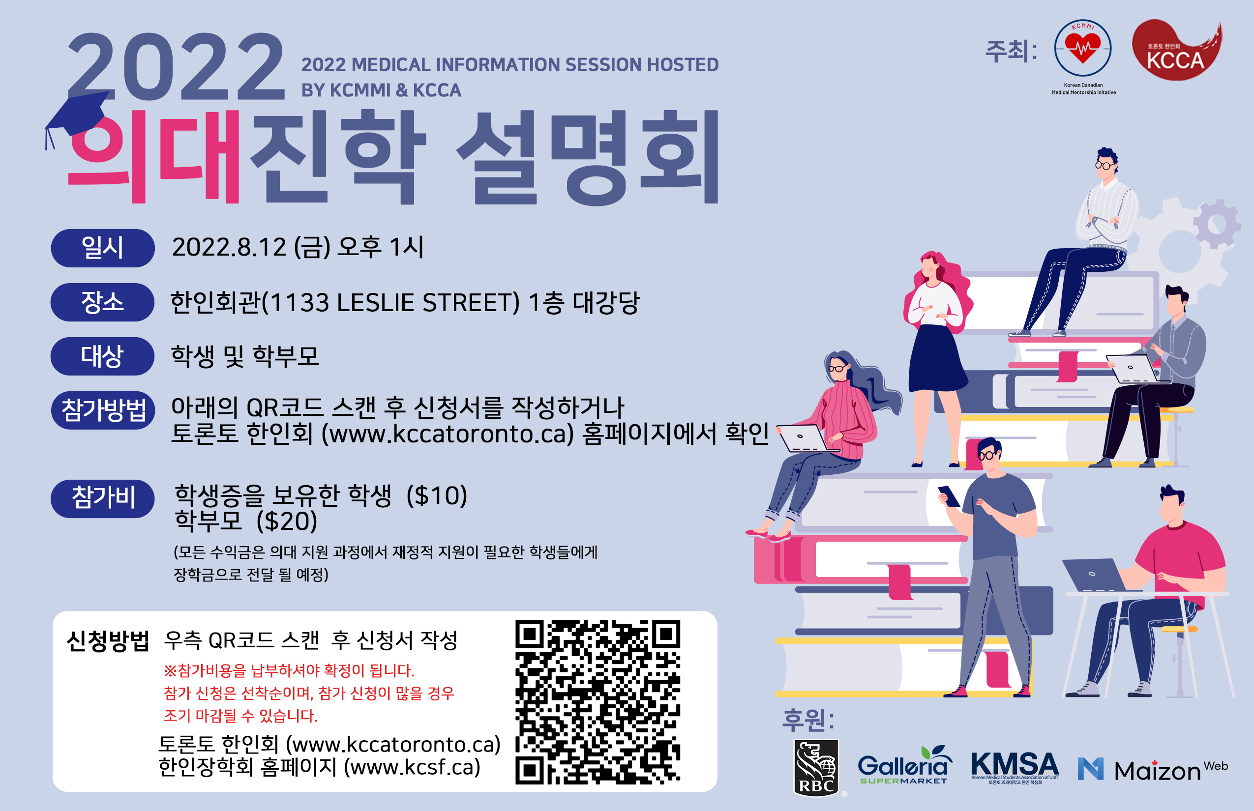 토론토 한인회(KCCA, Korean Canadian Cultural Association of Metropolitan Toronto: 회장 김정희)가 KCMMI(Korean Canadian Medical Mentorship Initiative: 대표 정찬영·이재윤)와 공동으로 캐나다 의대 진학을 돕기 위해 ‘2022 한인학생들을 위한 의대진학 설명회’를 8월12일(금) 오후 1시부터 한인회관(1133 Leslie St.) 대강당에서 연다.