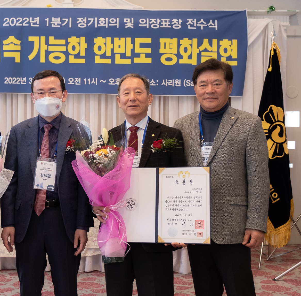뒤 이은 표창장 전수식은 김 총영사가 이병룡 상임고문과 이정훈 상임고문에게 대통령 표창장을 전수했다. 수상자들은 지난 19기 부회장으로 활동하며 기여한 공로를 인정받았다. 이병룡·이정훈 고문은 “앞으로도 한반도 평화를 위해 더욱 열심히 뛰겠다”는 소감을 밝혔다.
