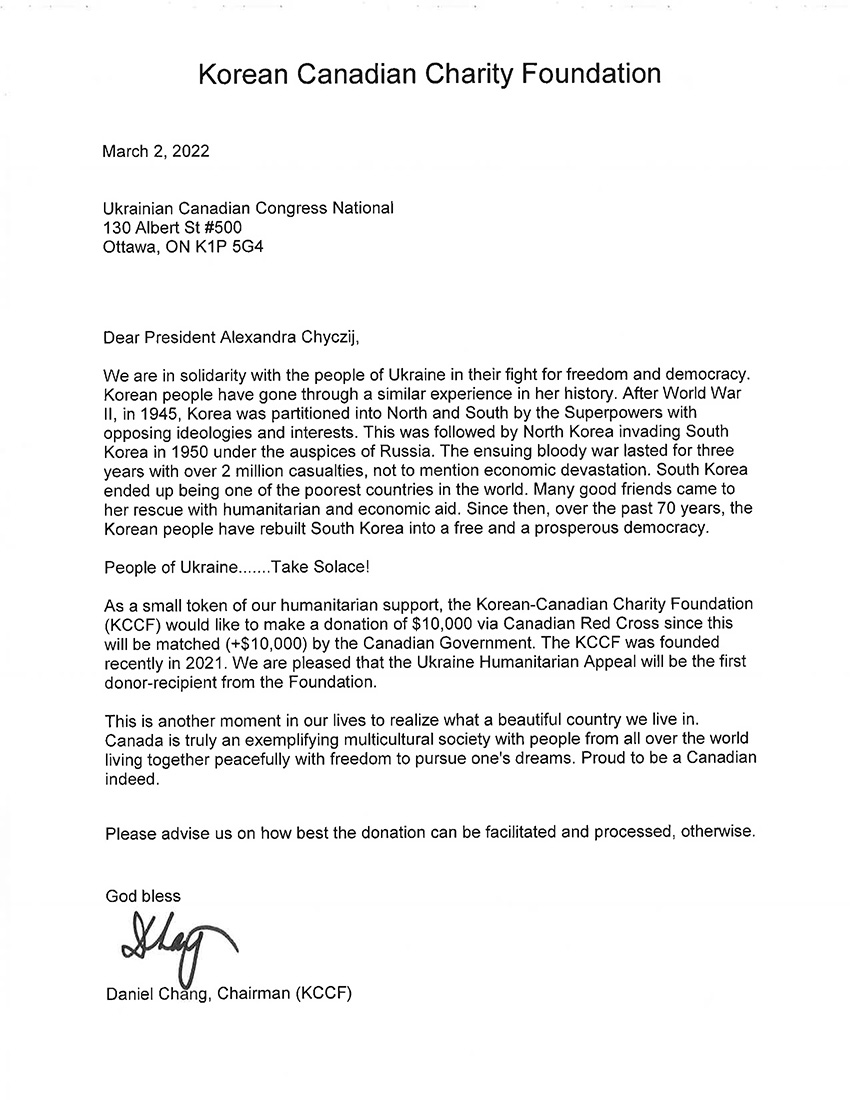 한카 자선재단(이사장 다니엘 장: Korean Canadian Charity Foundation= KCCF)이 러시아의 침공에 의해 큰 피해를 당하고 있는 우크라이나 국민들을 인도적으로 지원하기 위해 1 만 달러를 기부했다.