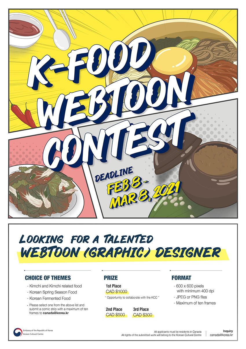 주 캐나다 한국문화원은 2월8일(월)부터 3월8일(월)까지 한 달간 ‘한식 웹툰 공모전‘을 개최한다.