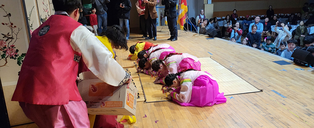 하례식은 한인회 박보흠 이사의 사회로 캐나다 한국무용연구회(예술감독 김미영)의 김향옥 씨가 공연한 힘찬 오고무로 시작해 국민의례에 이어 김정희 한인회장와 김영재 토론토 총영사의 신년인사, 김원희 시인의 ‘사랑의 성’시 낭송, 그리고 이상아 씨의 판소리 공연 등에 이어 떡국 오찬, 윤극영 동요‘까치까치 설날은~’설날노래 합창과 참석자들의 신년하례 순으로 마무리 됐다.