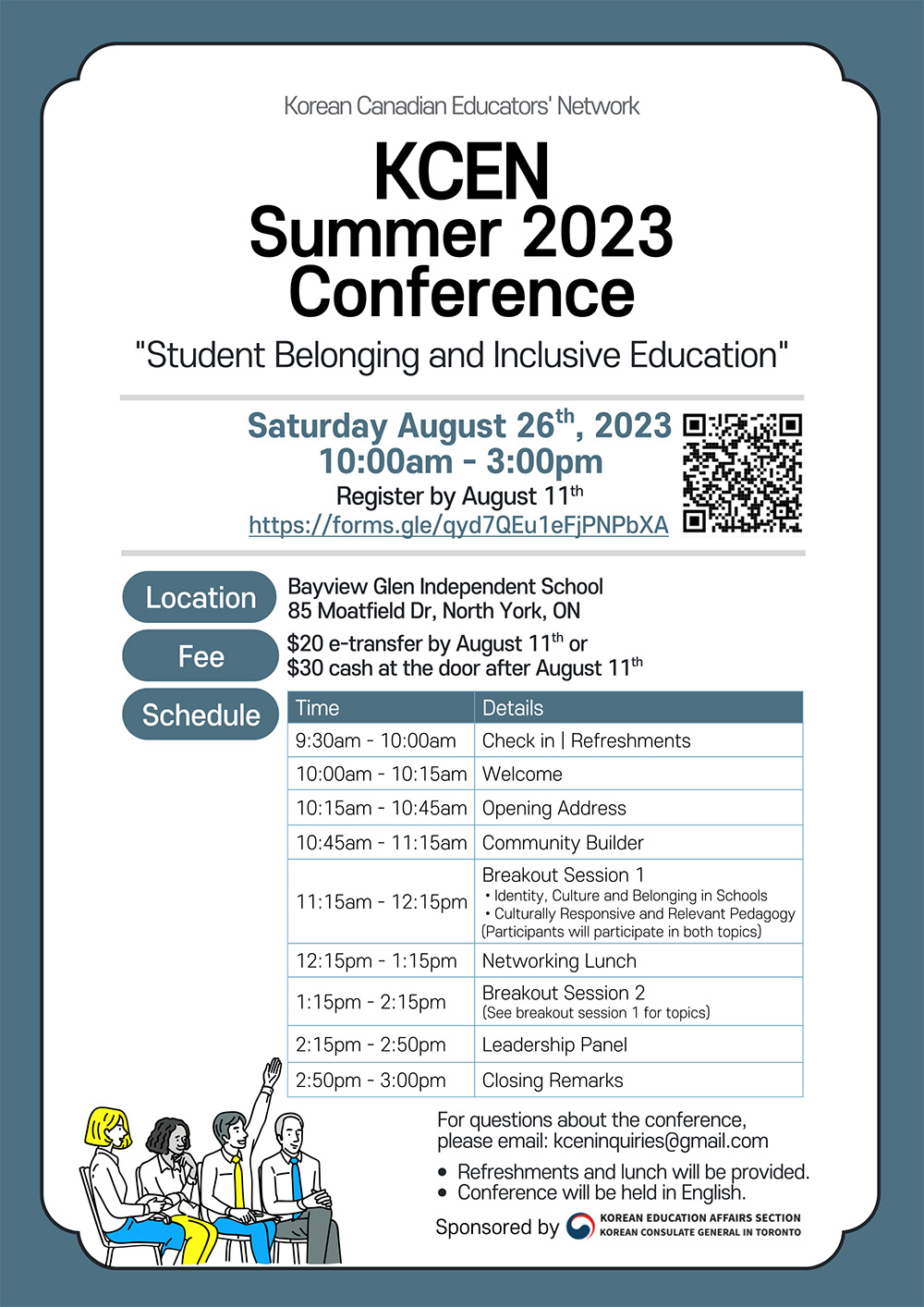 캐나다 한국인 교육자네트워크(Korean Canadian Educators’ Network: KCEN)가 여름 학회인 KCEN Summer 2023 Conference를 8월26일(토) 오전 10시부터 오후 3시까지 노스욕 Bayview Glen Independent School(85 Moatfield Dr,)에서 개최한다.