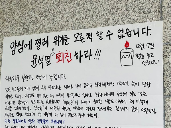 학생들이 붙인 대자보 말미에는 대부분 '12월 7일 윤석열 정권퇴진 범국민대회에 함께 나가자'는 호소가 담겨 있다. 더 이상 참지 못하는 대학생들이 12월 7일 광장으로 나와 다시 촛불을 들지 주목된다.