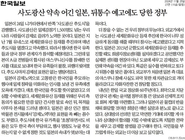 | 사도광산 추도식 파국 “굴욕 외교 결과” “참을 수 없는 무능” (0) | 2024.11.26 |