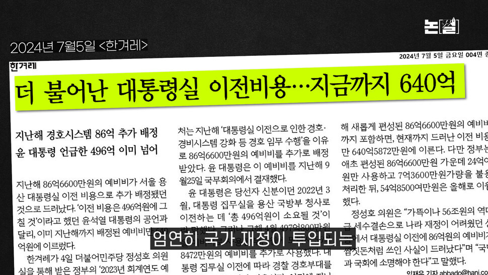 관저공사의 본질 역시 사치입니다. 외교부 장관이 썼던 건물을 리모델링하면서 사우나실과 드레스룸을 증축했다는 건데요. 자기 돈 아니라고 정말 너무 막 씁니다. 윤 대통령 부부는 나랏돈 쓰는 걸 당연한 권리로 생각하는 듯합니다. 거리낌이 없습니다. 집권 3년차에 이르도록 해마다 부자감세를 남발해서 역대급 세수펑크가 나니까 다른 예산은 다 줄이면서 대통령 해외 순방 예산과 검찰 등의 특활비 또는 수사비는 늘렸습니다. 파렴치합니다.