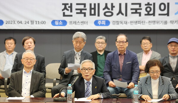 전국비상시국회의는 19일 "친일매국 반국가세력 윤석열 정권을 더 이상 두고 볼 수 없다"며 윤석열 정권의 퇴진을 요구하는 시국선언 기자회견을 20일 오전 11시 서울 정동 프란치스코 교육회관 211호에서 개최한다고 밝혔다. 시국선언에는 민주주의와 인권을 위해 일생을 바쳐온 원로 100인의 제안자와 학계‧종교계‧법조계‧노동계‧문화예술계 등에서 활약하는 1500인의 서명자가 참여했다. 이들은 28일 오후 3시에 열리는 '윤석열 정권 퇴진 시국대회'를 강력 지지하며 시민들의 적극적인 동참을 요청하고 있다.