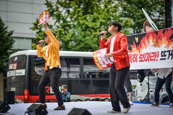20일 서울 시청역~숭례문 앞 대로에서 열린 99차 촛불대행진 7월 전국집중촛불에서 공연하는 재즈 타악기 연주자 류복성(왼쪽)과 코미디언 김미화(오른쪽)의 모습. 2024.7.20. 한국대학생진보연합 사진동아리 빛봄