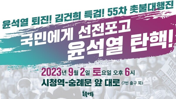 오후 6시부터는 촛불승리전환행동(촛불행동)이 55차 촛불대행진을 개최했다. 2만 명(주최 측 추산) 시민들은 "핵테러국 일본대사 철회하고 일본대사관 폐쇄하라" "일본의 핵테러 부역자 윤석열을 탄핵하자" "국민에게 전쟁선포 윤석열을 몰아내자" "주가조작 도로조작 역사조작 윤석열 탄핵하라" "우리가 홍범도다 매국노들 몰아내자" "항일정신 이어받아 친일매국노 윤석열을 몰아내자" 등의 구호를 외쳤다.