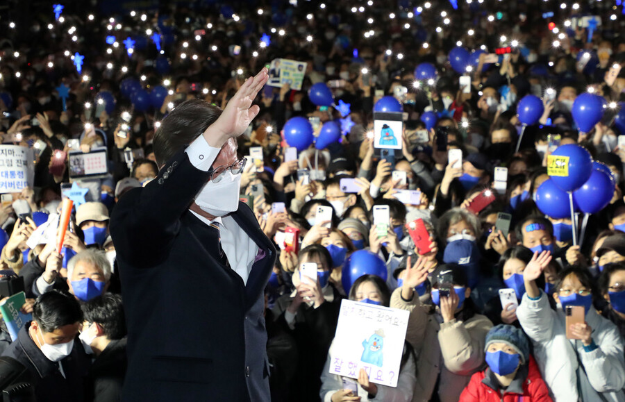 이재명 더불어민주당 대선 후보가 8일 저녁 서울 중구 청계광장에서 열린 마지막 유세에서 지지자와 시민들에게 인사하고 있다.