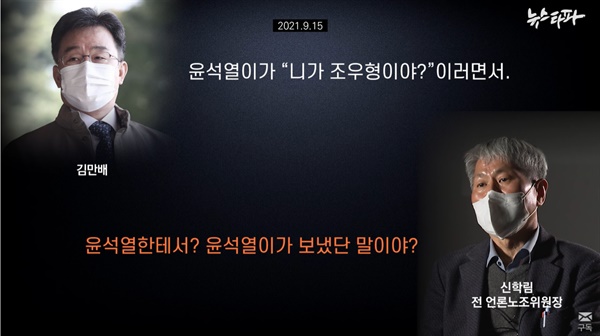 이날 <뉴스타파> 보도에 따르면, 김만배씨는 대장동 의혹이 막 커지던 2021년 9월 15일 경기도 성남시 판교의 한 커피숍에서 과거 동료였던 신학림 전 언론노조 위원장을 만났다. 대장동 의혹과 관련해 김만배씨의 실명은 아직 공개되지 않았고 박영수 전 국정농단사건 특별검사, 부산저축은행 사건의 관련성 등도 등장하지 않던 시기였다.