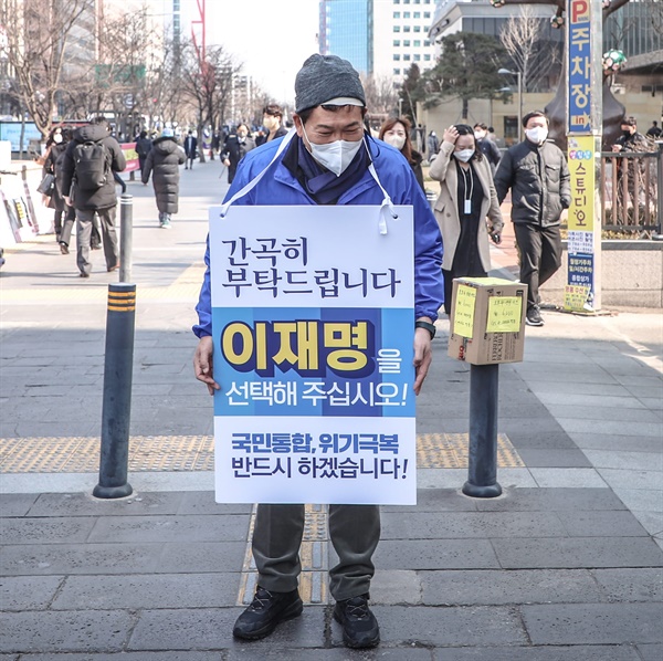 송 대표는 이날 붕대를 가리기 위해 회색 비니모자로 쓴 채로 유세에 나섰다. 이 후보가 서울 여의도 유세장에 도착하기 전 먼저 여의도역 5번 출구에 나와 ‘간곡히 부탁드립니다. 이재명을 선택해주십시오. 국민통합, 위기극복 반드시 하겠습니다’라고 적힌 팻말을 목에 걸고 1인 유세를 했다. 서영지 기자