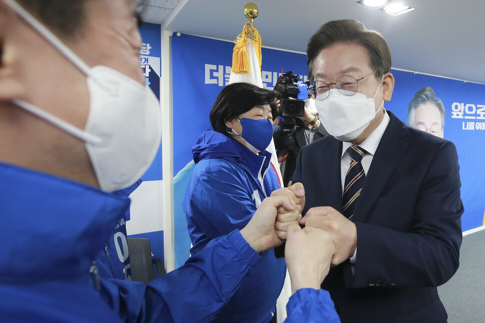이에 따라 민주당은 투표장에 지지층을 끌어오는 데 전력을 다하고 있다. 민주당은 이날도 <뉴스타파>가 보도한 화천대유 대주주 김만배씨의 녹취록을 근거로 ‘대장동 의혹의 몸통은 윤석열 후보’라고 주장했다. 김씨가 부산저축은행 불법대출 브로커 조우형씨를 박영수 전 특검에게 소개했고, 조씨는 박 전 특검을 통해 당시 주임검사였던 윤 후보로부터 수사 편의를 제공받았다는 취지의 말을 한 만큼, 그간 이 후보 발목을 잡았던 대장동 개발특혜 의혹의 화살을 ‘윤석열 책임론’으로 돌릴 수 있다고 보는 것이다. 우상호 본부장은 이날 “김만배 육성으로 윤 후보가 부산저축은행 (불법대출 사건 핵심인물을) 봐줬다는 사실이 드러났다. 뻔뻔하게도 여전히 대장동이 이재명 탓이라고 떠든다”고 공세 수위를 높였다. 강득구 의원은 이날 윤 후보를 직무유기 및 특가법상 뇌물 혐의로 고위공직자범죄수사처에 고발했다.