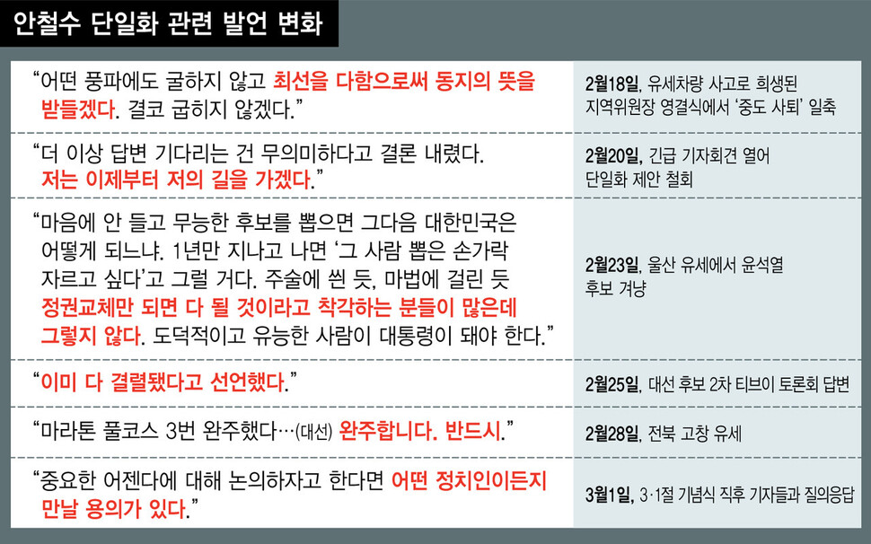 안 전 후보는 지난달 20일 기자회견에서 ‘단일화 결렬’을 선언한 이후 “대통령이 될 사람은 최소한 어떤 머리를 빌릴 것인지 아는 머리를 가지고 있는 사람이어야 한다” “그 사람(윤 후보)이 당선되면 대한민국이 어떻게 되겠는가. 1년만 지나면 그 사람 뽑은 손가락을 자르고 싶어질 것 (2월23일, 울산)” “마라톤 풀코스 3번 완주했다…(대선) 완주합니다. 반드시.”(2월28일, 전북 고창) 등 윤 후보에 대한 원색 비난과 완주 의지를 피력해왔다.