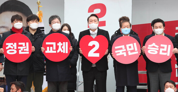 윤석열 국민의힘 대선 후보가 1일 오후 서울 서대문구 현대백화점 신촌점 유플렉스 앞에서 열린 유세에서 이준석 대표, 유승민, 홍준표, 원희룡 대선 경선 후보들과 정권교체 2번 국민승리 손팻말을 들고 있다.