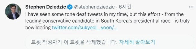 더불어민주당은 윤 후보 쪽에 우크라이나 국민에게 사과할 것을 촉구했다. 전용기 민주당 선대위 대변인은 이날 논평을 내어 “윤 후보는 응원인지, 장난인지 모를 트위트를 올렸고 논란이 일자 바로 삭제했다. 제 발 저린 것”이라며 “개사과 당시에도 깊은 반성은 없었고, 이젠 국가적 망신까지 사고 있다”고 비판했다. 배지현 기자