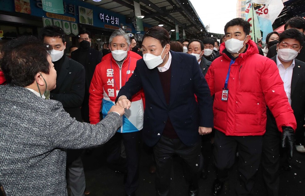윤석열 국민의힘 대선 후보가 16일 오전 광주 광산구 송정매일시장에서 열린 거점유세에 참석하며 시민들과 주먹 인사를 하고 있다.