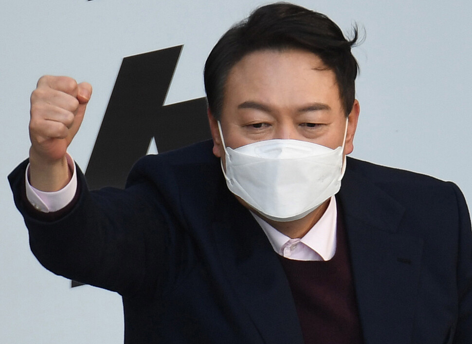 국민의힘 윤석열 대선 후보가 지난 19일 오후 경남 김해시 김수로왕릉 앞 광장에서 유세한 뒤 주먹질 세리머니를 하고 있다.