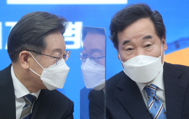더불어민주당 이재명 대선 후보와 이낙연 총괄선대위원장이 9일 서울 여의도 당사에서 열린 중앙선거대책위원회 회의에서 대화하고 있다.