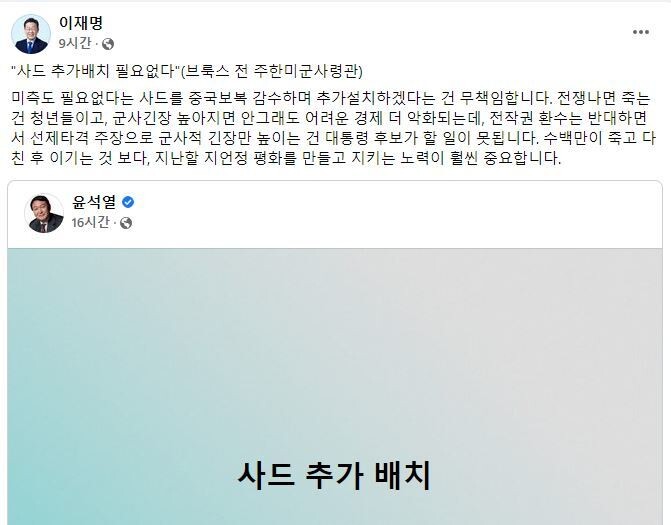 윤 후보는 이날 인천시 강화군 강화제적봉평화전망대를 찾아 “북한은 올해 들어 벌써 1월 한 달에만 7차례의 미사일 도발을 감행했다. 결국 저는 우리 국민의 생명과 안전을 지키기 위한 특단의 조치를 생각하게 됐다”며 이렇게 말했다. 윤 후보는 지난달 30일에도 페이스북에 ‘사드 추가 배치’라는 여섯 글자 공약을 올린 바 있다. ‘안보 포퓰리즘’이라는 비판이 여권에서 나오는 데 대해 윤 후보는 “(나보고) 전쟁광이라고 얘기를 하는데 사드라고 하는 것은 공격용 무기가 아니지 않나”라며 “방어용 무기를 구축하는 것을 전쟁광이라고 표현하는 것은 안보를 포기한 것이다. 선제타격이라고 하는 불가피한 자위권 행사와 사드를 비롯한 미사일 중층 방어망을 구축하는 것을 전쟁 도발 행위라고 규정하는 사람들은 국가안보와 국정을 담당할 자세가 안 돼 있다고 본다”고 날을 세웠다. 윤 후보는 또한 “평화통일은 우리에게 힘이 있을 때 가능한 것이다. 힘이 뒷받침되어야 우리가 바라는 자유 평화 번영의 통일 이룩할 수 있는 것”이라고 강조했다.