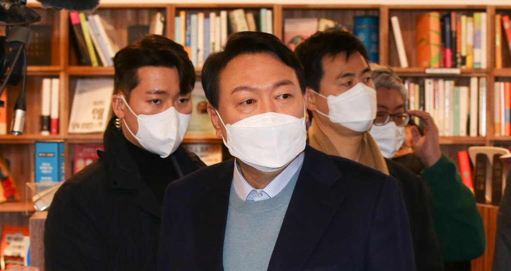 윤석열 국민의힘 대선 후보가 23일 서울 여의도 한 카페에서 열린 ‘국민공약 언박싱 데이’ 행사에서 마스크를 고쳐 쓰고 있다.