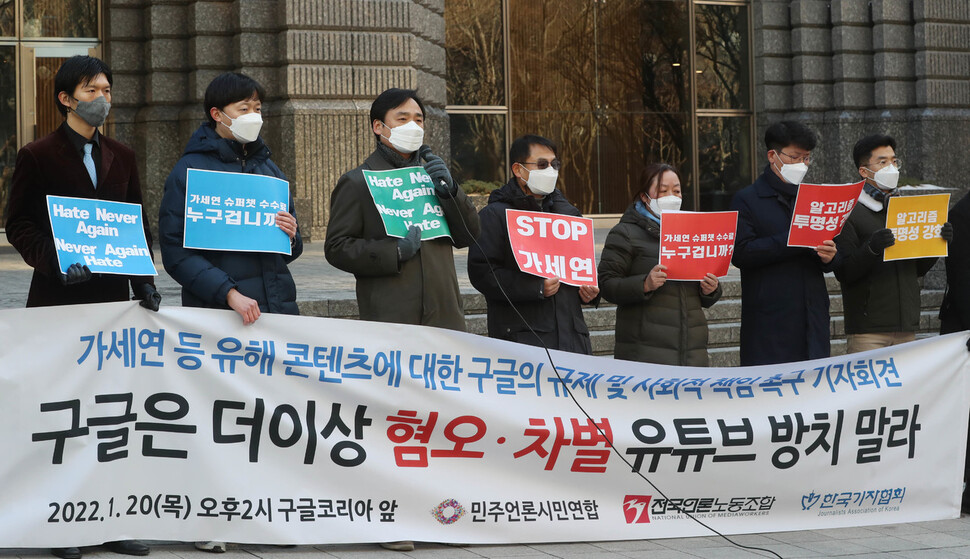 민주언론시민연합, 전국언론노동조합, 한국기자협회가 20일 오후 서울 강남구 구글코리아 본사 앞에서 연 기자회견에서 가로세로연구소 등 혐오·차별 유튜브 채널에 대한 구글의 규제 및 사회적 책임을 촉구하고 있다.