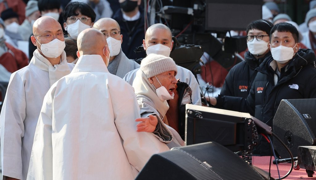 불교 승려대회를 반대하는 신도들과 실랑이 모습.