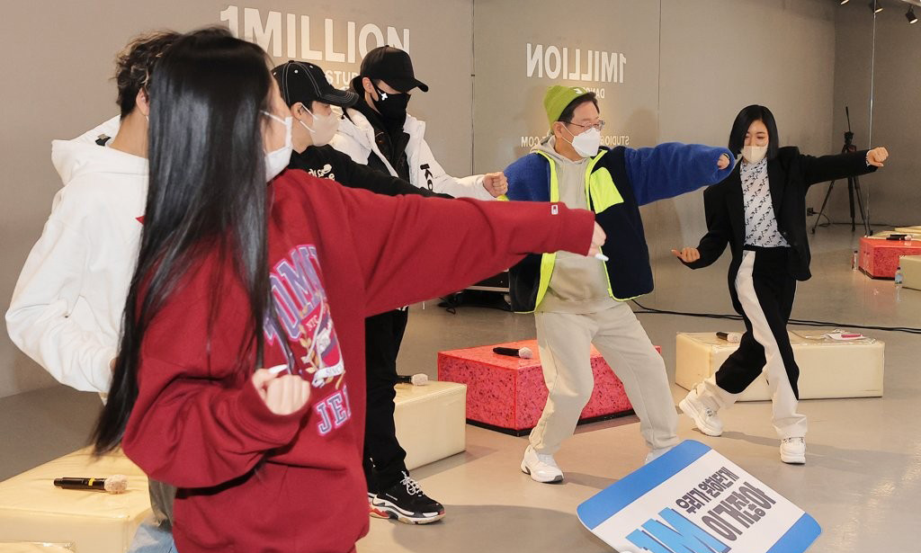 춤동작 배우는 이재명=더불어민주당 이재명 대선 후보가 20일 서울 성동구 원밀리언 댄스 스튜디오에서 'JM, 우리가 원하던게 이거잖아 - 리아킴, 백구영, 영제이, 시미즈, 하리무, 루트와의 만남'을 갖고 댄서들에게 춤동작을 배우고 있다.