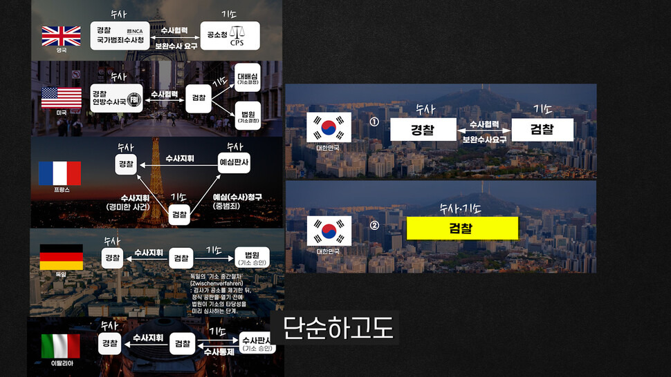 외국 수사·기소 제도의 공통점은 수사·기소 권한과 절차를 여러 기관에 분산시키고 있다는 것입니다. 이에 견줘 검사가 직접 수사·기소하는 우리나라는 다른 어느 나라에서도 볼 수 없는, 너무나 단순하고도 위험한 구조를 갖고 있습니다. 바로 이 구조를 깨자는 게 검찰개혁입니다.