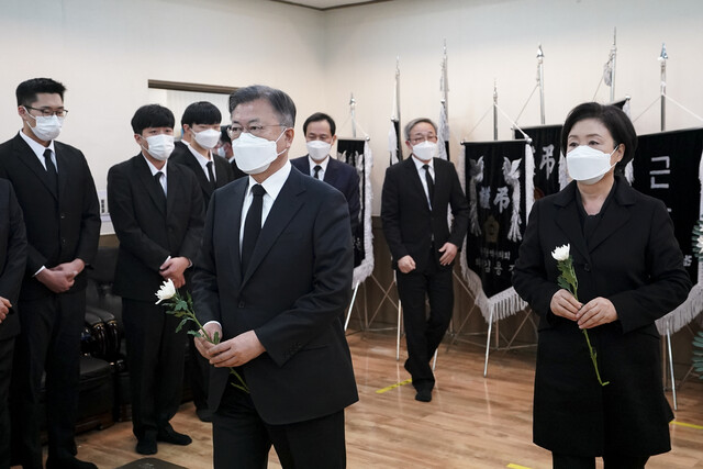 문재인 대통령과 김정숙 여사가 9일 오후 광주 동구 조선대학교병원 장례식장에 마련된 이한열 열사 모친 고(故) 배은심 여사의 빈소를 찾아 헌화하고 있다.