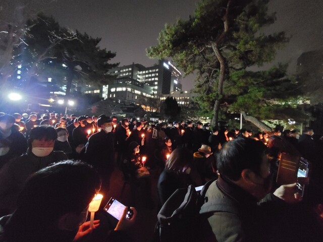 이한열 열사의 어머니 고 배은심 여사의 추도식이 시작되기 전, 배 여사의 생전 육성이 울려 퍼졌다. 2017년 5월 세월호 유가족들이 광주 5·18 국립묘지를 찾았을 때 남긴 메시지다. 10일 저녁 서울 서대문구 연세대학교에 마련된 ‘한열 동산’에서 이한열기념사업회 주최로 열린 배 여사의 추도식에는 추운 날씨에도 3백명이 넘는 시민들이 모여 촛불을 켜고 자리를 지켰다. 한 손엔 핫팩, 한 손엔 추도사가 인쇄된 종이를 들고 선 이들은 20대 청년부터 머리가 희끗한 50대, 60대 장년까지 다양했다.