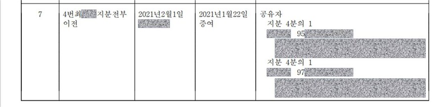 - 2021년 1월22일 최씨, 경기 양평군 소재 3개 필지 지분(337㎡) 큰딸 자녀 2명에게 증여(시가 20억원 추정)