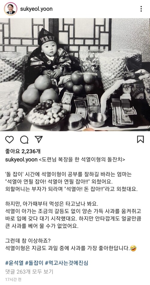 이에 앞서서는 자신의 인스타그램에 과거 돌잔치 때 사과를 잡고 있는 흑백사진과 함께 "석열이 아가는 돌잡이 때 양손 가득 사과를 움켜쥐고 바로 입에 갖다 대기 시작했대요. 그런데 참 이상하죠? 석열이 형은 지금도 과일 중에 사과를 가장 좋아한답니다"라는 글을 올리기도 했다.