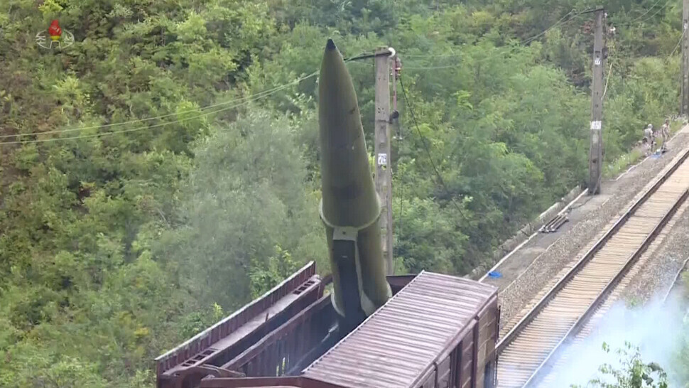 북한이 지난 15일 단거리 탄도미사일을 열차에서 발사 준비를 하고 있다. 조선중앙통신 연합뉴스