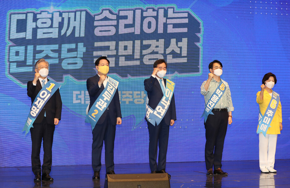 5일 오후 충북 청주시 서원구 CJB컨벤션센터에서 더불어민주당 대선 후보를 뽑기 위한 '충북·세종 민주당 순회 경선'이 치러지고 있다. 이재명(왼쪽부터), 김두관, 이낙연, 박용진, 추미애 후보. 연합뉴스