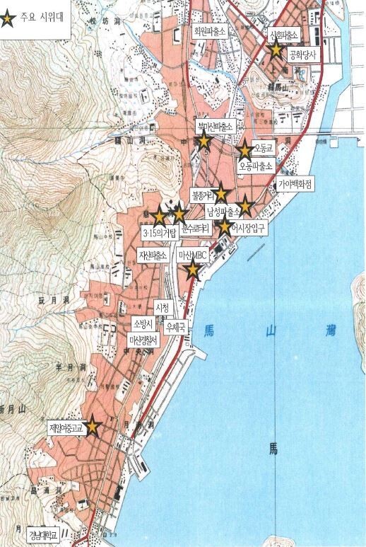1979년 10월18일 경남대 시위 학생들의 시내 진출로. 부마민주항쟁 진상규명 및 관련자명예회복심의위원회 부마민주항쟁 진상조사보고서.