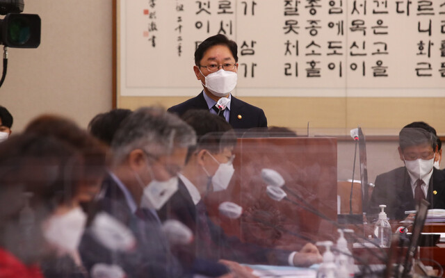 박범계 법무부 장관이 22일 국회에서 열린 법제사법위원회 전체회의에서 업무보고를 하고 있다. 연합뉴스