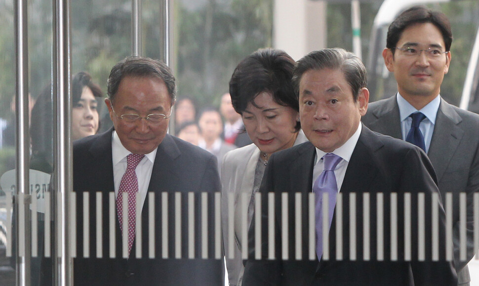 이건희 삼성그룹 회장과 부인 홍라희씨, 이재용(현 삼성전자 부회장)·이부진(현 호텔신라 사장)이 2010년 12월1일 오후 ‘자랑스런 삼성인상’ 시상식에 참석하기 위해 서울 서초동 삼성본관에 들어서고 있다.