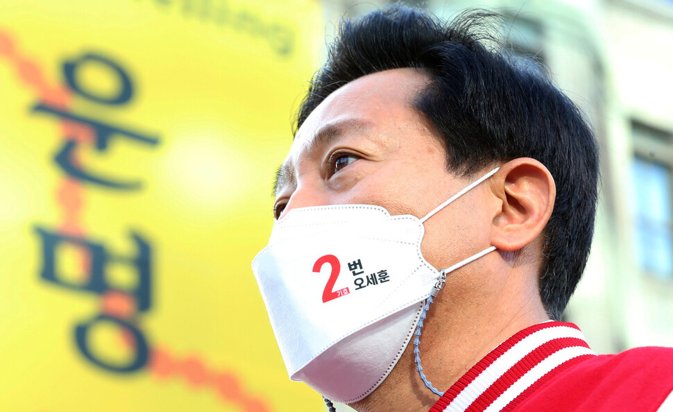 오세훈 국민의힘 서울시장 후보가 2일 오전 서울 종로구 광화문역 주변에서 출근길 선거유세를 위해 신호등을 기다리고 있다.